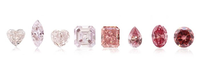 粉鑽的顏色分級,從左到右:微粉、微淺粉、淺粉、淡彩分、中彩粉、濃彩粉、艷彩粉和暗彩粉。