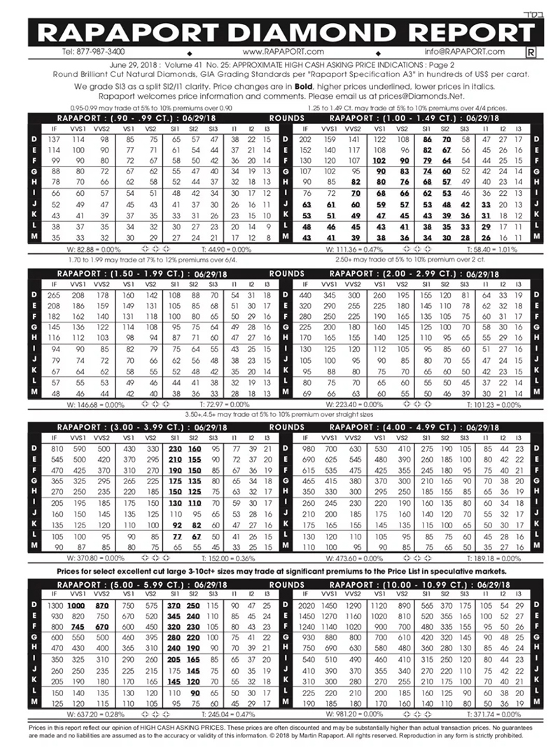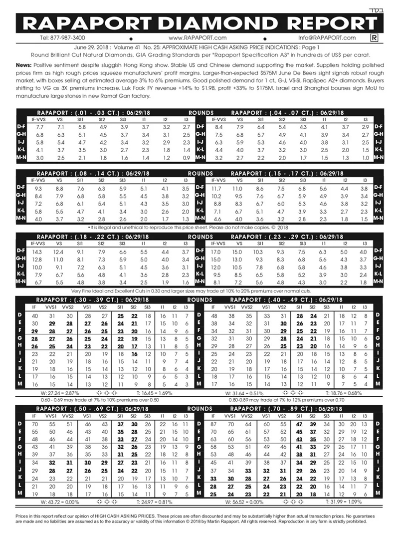 關於國際鑽石報價表(Rapaport Diamond Report),要追溯到70年代以前,許多鑽石認證實驗室都陸續關閉了,也沒有一個可靠的鑽石報價表。當時生存下來的鑽石認證實驗室僅有GIA,HRD,IGI,EGL和巴黎的Chambre de Commerce。至於價格表,直到1978年,一位來自紐約鑽石家族的大佬Martin Rapaport,他根據美國寶石學院 GIA(Gemological Institute of America)的評級標準在每週五發佈一份圓形鑽石的批發價格表,除此之外,每個月還會發佈花式切割鑽石的價格表,在世界各地傳播。